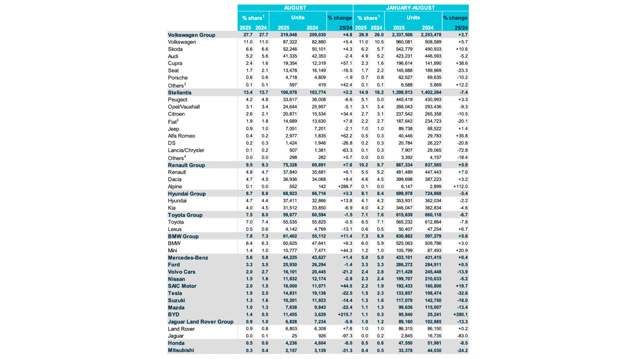 Tesla için alarm zillerinin çalmasına neden olan asıl veri, sektörün geri kalanıyla yapılan karşılaştırmadan geliyor. ACEA verilerine göre, Tesla satışlarının düştüğü aynı Ağustos 2025 döneminde: